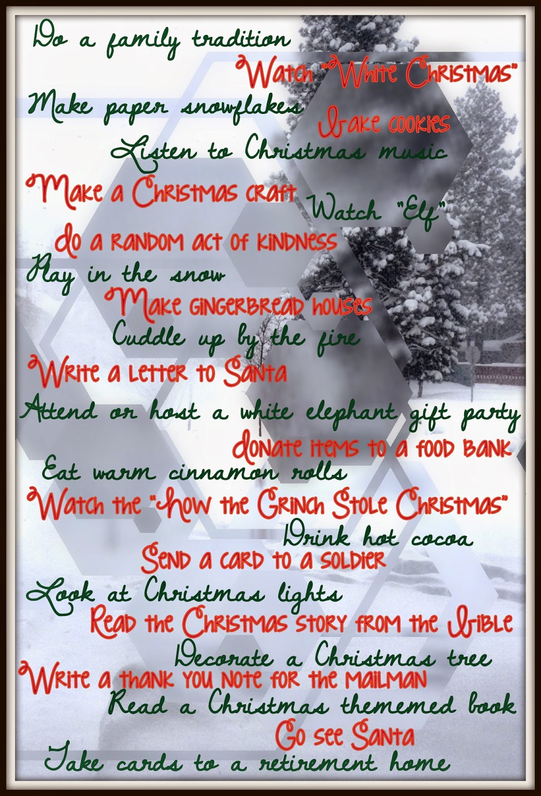 I’m a firm believer in holding off on all things Christmas until Thanksgiving has been fully celebrated and appreciated. So, here I am, on the day after Thanksgiving to kick off the Christmas season! I decided I would put together a fun little Christmas Season Bucket List, as I’m sure comes as no surprise. Sadly, I only completed 16 of my 20 items on my Awesome Autumn Bucket List. The following list is sure to be completed, as it is filled with all the things that our family loves to do every year around this beautiful time of year when we celebrate the birth of our Savior.