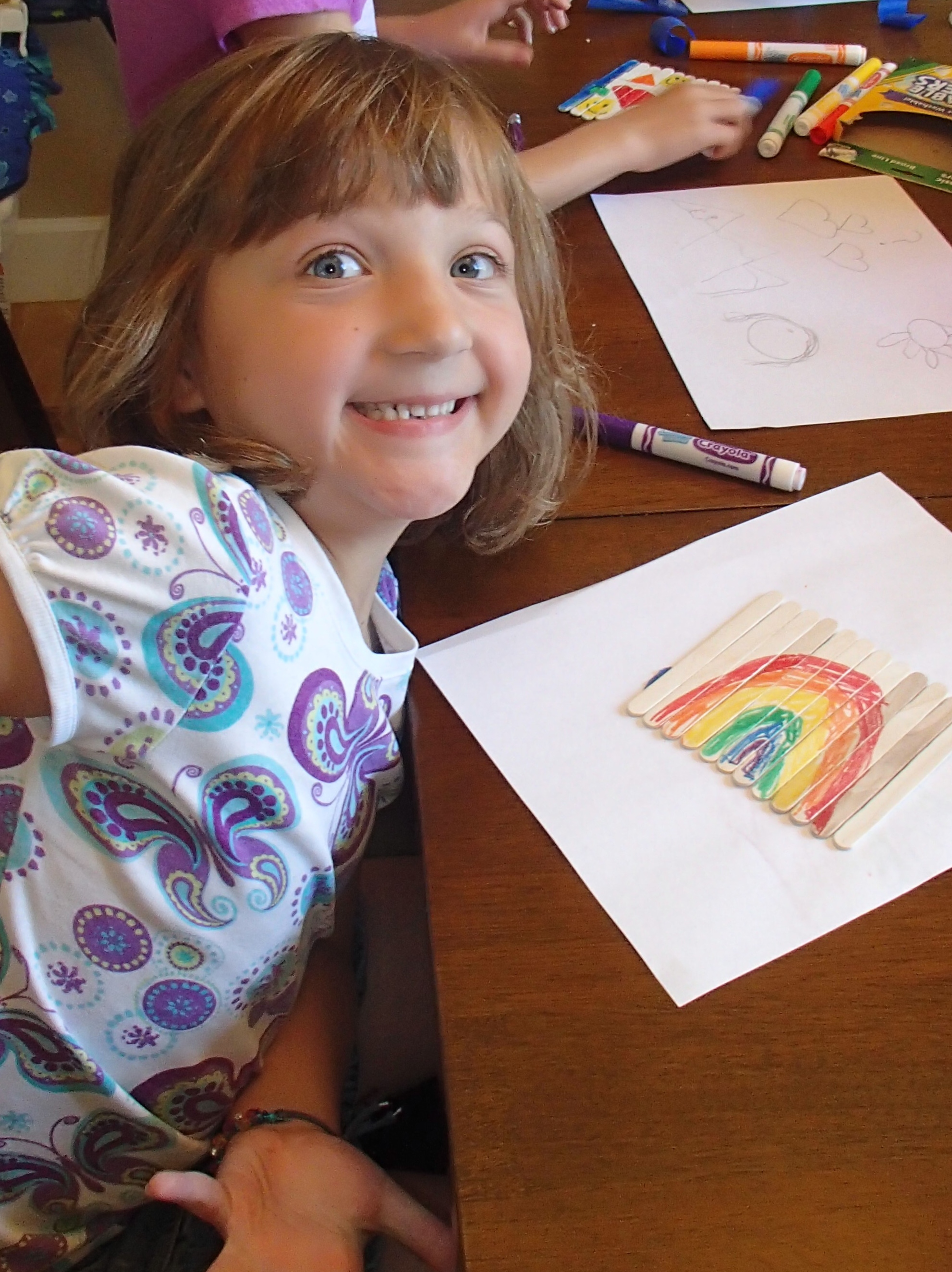 We usually invite other families to join us so that we can have a card making party and be armed with more cards to give out when we arrive at the assisted living home. I’ve learned that the best time to arrive is around lunch or dinner time, to deliver cards while they are all gathered for meals. On times when we have arrived outside of these hours, we have merely placed the cards on the tables for the residents to see when they arrive. Our cards usually include little notes wishing them a nice day with a drawing and some stickers. I think it’s fun to include the ages of the kids who are creating the cards, to personalize the experience a little more for the recipient.